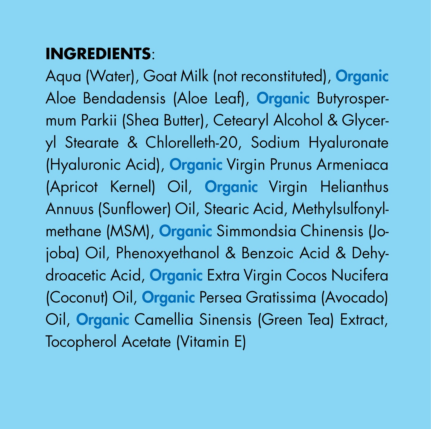 aqua (water), goat milk (not reconstituted), organic aloe bendadensis (aloe leaf), organic butyrospermum parkii (shea butter), cetearyl alcohol and glyceryl stearate and chlorelleth-20, sodium hyaluronate (hyaluronic acid), organic virgin prunus armeniaca (apricot kernel) oil, organic virgin helianthus annuus (sunflower) oil, stearic acid, methylsulfonylmethane (MSM), organic simmondsia chinensis (jojoba) oil, phenoxyethanol and benzoic acid and dehydroacetic acid, organic extra virgin cocos nucifera (coconut) oil, organic persea gratissima (avocado) oil, organic camellia sinensis (green tea) extract, tocopherol acetate (vitamin E)